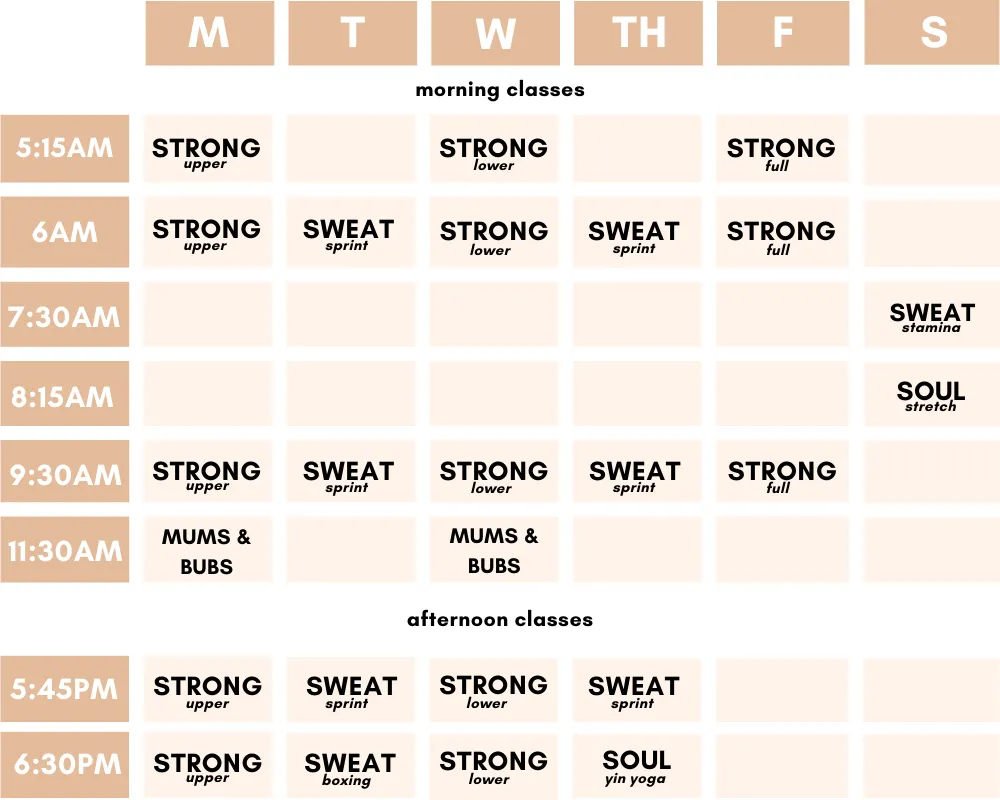 With over 20 group training times on offer from Monday-Saturday, be strongHer's sessions are based around strength, overall fitness & adequate recovery. Our sessions compliment each other and are built to work together to get the most of out of your training.